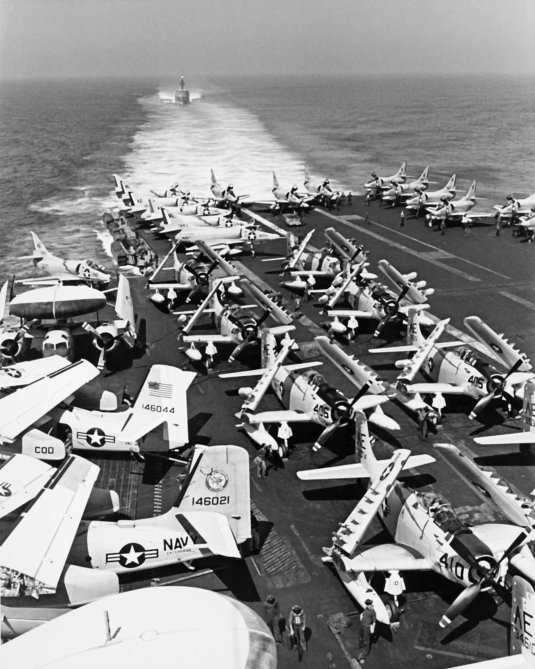 View of the flight deck of the U.S. Navy aircraft carrier USS Enterprise (CVAN-65) flight deck during the “Operation Sea Orbit” in August 1964. Visible are various aircraft of Carrier Air Wing Six (CVW-6) (from left to right): two Grumman E-1B Tracer of airborne early warning squadron VAW-12 Det.65 Bats, two Grumman C-1A Trader of fleet replenishment squadron VRC-40 Det. 65 Rawhides, 14 Douglas A-4C Skyhawk, five of attack squadron VA-66 Waldos, four of VA-64 Black Lancers, and five of VA-76 Spirits, and eight Douglas A-1H Skyraider of VA-65 Tigers. The nuclear-powered guided missile cruiser USS Bainbridge (DLGN-25) is visible in the background. 1964.